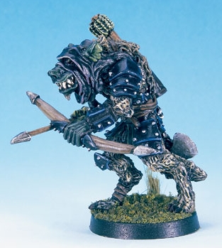 Feats: EnduranceB, Far Shot, Point Blank Shot, Precise Shot, TrackB, Two-Weapon FightingV Languages: Common, Elvish, Gnoll (His natural languages are Common and Elvish because he was raised by elves. Gnoll is a learned language.) Special Abilities: Natural Armor +1, Two-Weapon Combat Stytle, Favored Enemy (Plants +2), Darkvision 60 ft. Possessions: +1 studded leather, masterwork morningstar, masterwork cold iron throwing axe, 2 daggers, 20 alchemical silver arrows, masterwork composite longbow [+4 Str], 3 potions of cure light wounds, potion of expeditious retreat, healer's kit, vial of holy water, cloak of elvenkind, eyes of the eagle Background: A chaotic good gnoll ranger raised by "enlightened" wood elves after his gnoll tribe was wiped out by orcs. For decades, the orcs and gnolls of Myrewood fought to destroy each other, while the elves and humans kept them contained. The bloody conflict finally ended when the orcs acquired an artifact that tipped the balance. However, the victory also weakened the orcs and the humans obliterated them even as the elves picked through the ruins of the gnoll settlement. An elvish ranger, who had recently lost her own child, found the infant "Blue Nose" and adopted him as her child. He was welcomed into the "enlightened" tribe and raised as one of their own. As a result of his unusual upbringing, he is strangely relaxed, friendly, loquacious, jovial and sometimes silly. Like the elves of his tribe, he is a vegetarian and dislikes meat. The Myrewood is so named because of the dangerous plant life that is so fond of eating humanoids. His last name is taken from his adoptive elven parents and is pronounced "soon-a-lee-lef-cut-e-ay". His advancement plans are to continue as a single-classed ranger. Skill points will continue to go into Survival, Spot, Listen, Handle Animal and others, in that order. At level 8 he will raise his Intelligence to gain more skill points. His favorite spells are entangle and pass without trace. Special Possessions: His elven bow, although not magical, was a gift from his adoptive grandmother and he will go to outrageous lengths to protect it, recover it or repair it. Credits and Notes: Inspired by the Chainmail miniature in the picture above, which also appears on page 114 of Dragon number 290. |